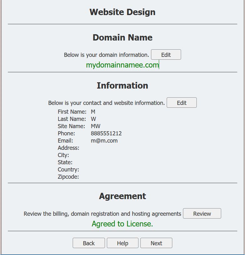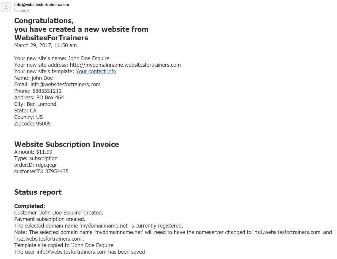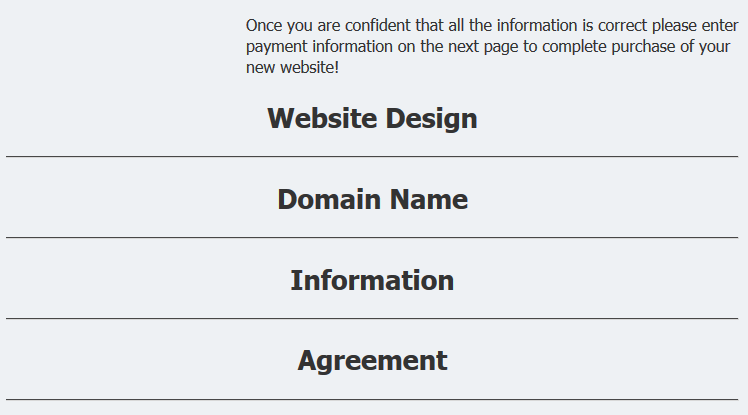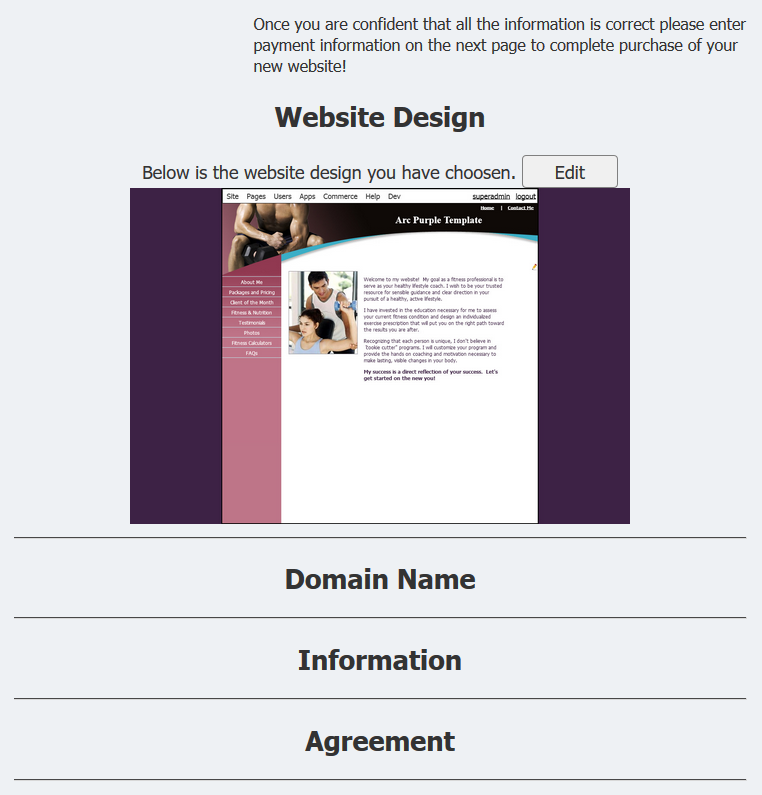You will then be redirected to a confirmation page listing the information you entered, and also receive a welcome email with additional information and a link to access your site. Using that link, you will be able to edit your website before the domain name is properly directed to your site, which can take up to 48 hours. You will also recieve a payment invoice, and a status report in the welcome email.