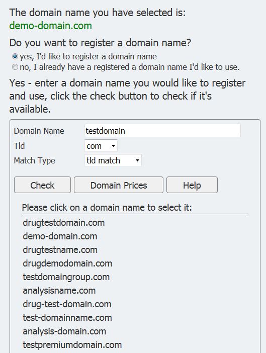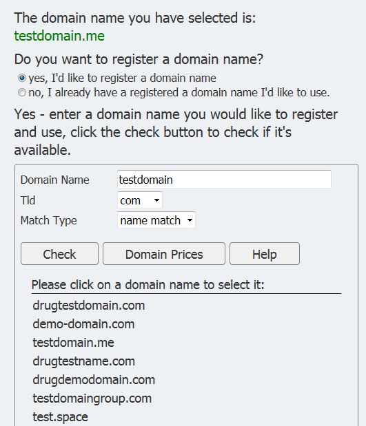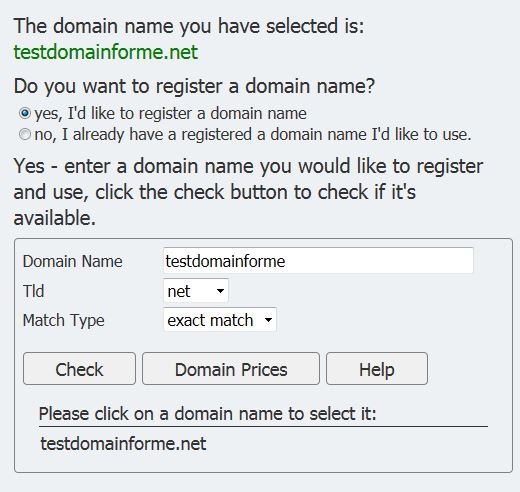 If you choose to register a domain name, select 'yes'. You may then enter a domain name to search for in the Domain Name input. It must be only valid characters 0 to 9, a to z, and - or _. The case, upper capitals or lower, doesn't matter. The internet is not sensitive to the domain name's case.