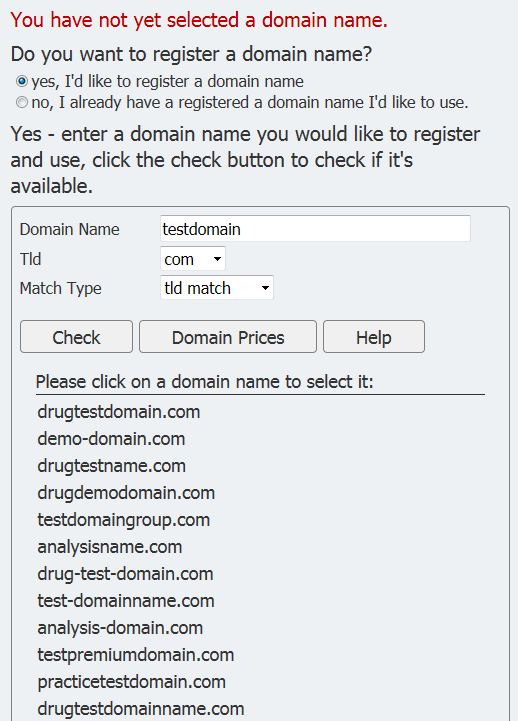You may also select to search by TLD. Select 'tld match' and a TLD from the drop down menus and click Check. The search will return available domain names you can select for your website by clickin gon one. Be sure to select a domain name before goin gto the next step.