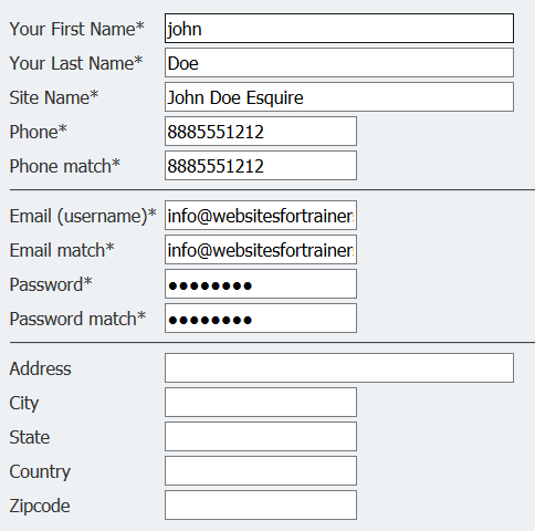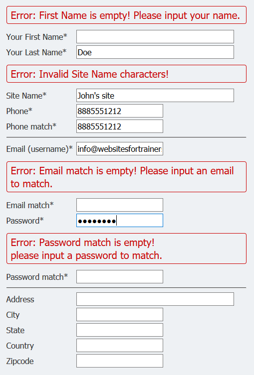 First Name, Last Name, Site Name, Country and Address all must only use characters alpha-numeric (0-9, a-z, A-Z), dash(-), underbar(_), dot(.), comma (,), exclaimation (!), or space( ).