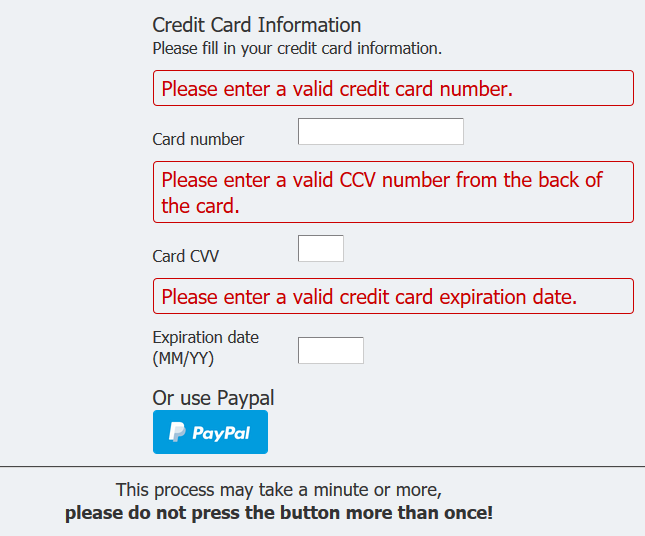 To pay by credit card, enter a valid 16 character Credit Card number, 3 digit CVV from the back of the card and the expiration date from the front of the card.