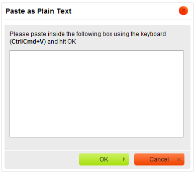 button on the toolbar. If the browser blocks CKEditor toolbar's access to clipboard, a Paste as Plain Text dialog window will appear and you will be asked to paste the fragment into the text box using the Ctrl+V keyboard shortcut.