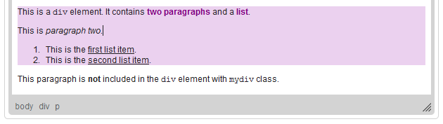 As visible on the elements path, when the cursor is placed in the second paragraph, the hierarchy of HTML elements includes just the html and p elements.