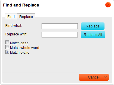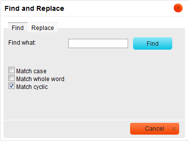 - Match cyclic – checking this option means that after CKEditor reaches the end of the document, the search and replace continues from the beginning of the text. This option is checked by default.
