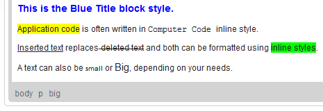 toolbar button. The Styles drop-down list contains a number of pre-defined block and inline styles that you can use. To make the choice easier, the style names are displayed in a style that they represent, giving you a preview of what the text will look like.