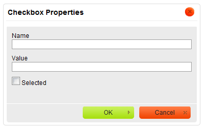 toolbar button. The Checkbox Properties dialog window that will open lets you set the name and value of a checkbox as well as decide whether it should be selected by default.