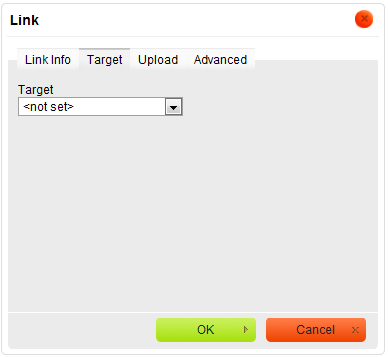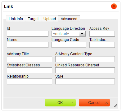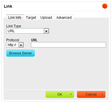 When you choose this link type, two Link dialog window tabs will become available: the Link Info tab and the Advanced tab.