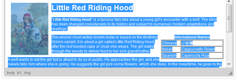 Another method to select document contents is to use CKEditor elements path to highlight the HTML building blocks of the document. To use this feature, click an element's name on the elements path with your mouse. You can also use the Alt+F11 keyboard shortcut to enter the elements path, and then navigate between the elements with the Tab and Shift+Tab (or Left and Right Arrow) keys. To select an element with your keyboard, use the Enter or Space keys.