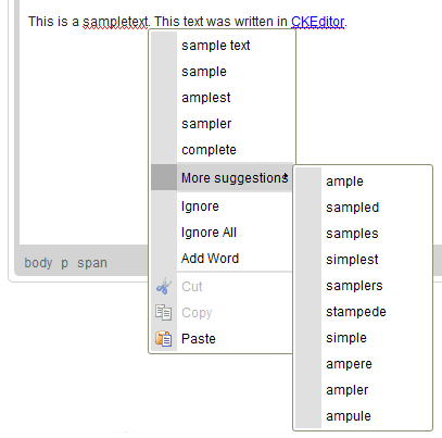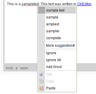 SCAYT marked two phrases as errors. The first one, "sampletext", is missing the space between what should be two separate words. We can easily fix it by placing the cursor anywhere inside the phrase and opening the context menu with the right mouse button or the Menu/Application key on your keyboard. Once SCAYT is enabled, the context menu will contain spellchecker suggestions on how to correct the error.