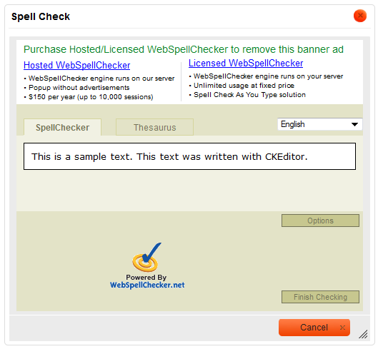 Please note that the free spell checking solution provided by WebSpellChecker.net is advertisement-supported. To remove the ads, you need to buy a license. For licensing terms check the WebSpellChecker.net website.